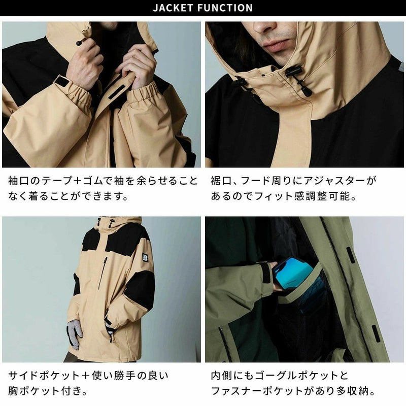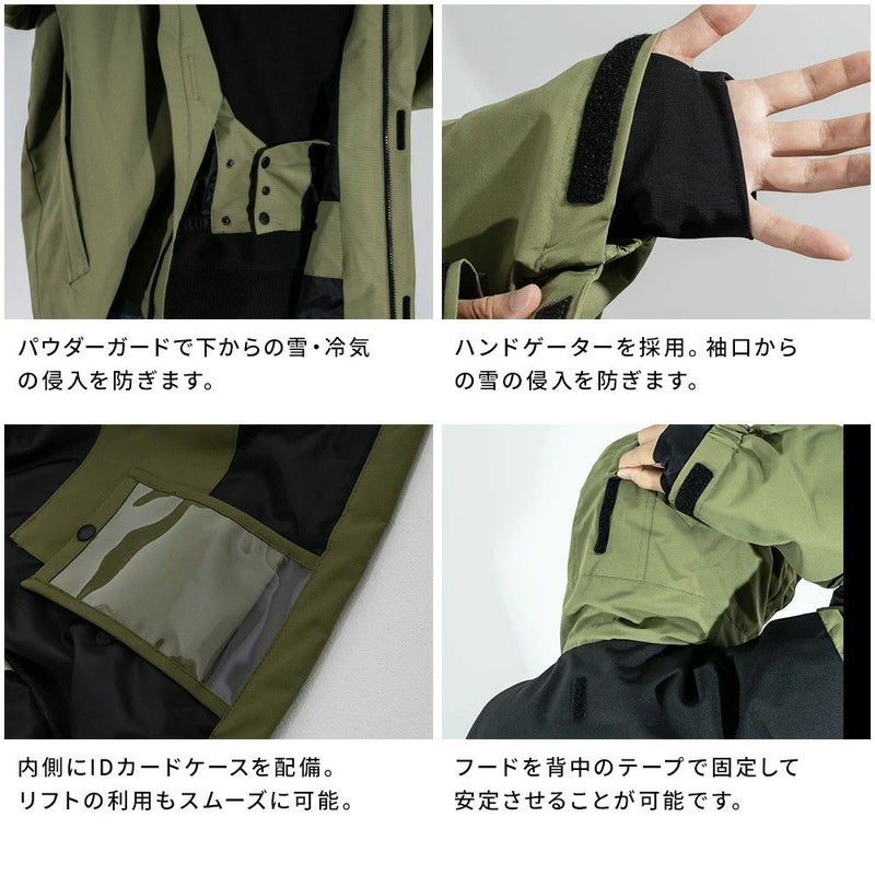 フード、袖口、裾が調整可能で、2つのサイドポケット、ファスナー付き胸ポケット、ゴーグルポケット、IDカードケースが備わり収納力も充実。