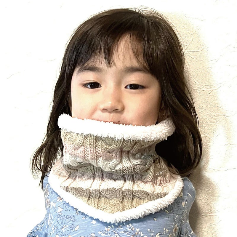 ケーブルボーダーニット帽とお揃いで使えるネックウォーマーを作りました。首元の前から入り込む風を防ぐために前部分を三角形にした形状です。内側にはふかふかのボアを付けました。暖かく機能的なネックウォーマーです。形は頭からすぽっとかぶるシンプルな定番にしました。アクティブな子供たちにはマフラーは危険な場面もあるので、やっぱりかぶるタイプのネックウォーマーが安心です。帽子とお揃いで使っていただけるとお洒落で可愛らしいウィンタースタイルの出来上がりです。