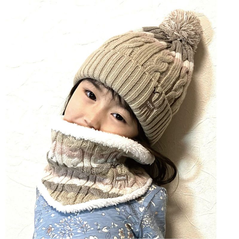 ケーブルボーダーニット帽とお揃いで使えるネックウォーマーを作りました。首元の前から入り込む風を防ぐために前部分を三角形にした形状です。内側にはふかふかのボアを付けました。暖かく機能的なネックウォーマーです。形は頭からすぽっとかぶるシンプルな定番にしました。アクティブな子供たちにはマフラーは危険な場面もあるので、やっぱりかぶるタイプのネックウォーマーが安心です。帽子とお揃いで使っていただけるとお洒落で可愛らしいウィンタースタイルの出来上がりです。