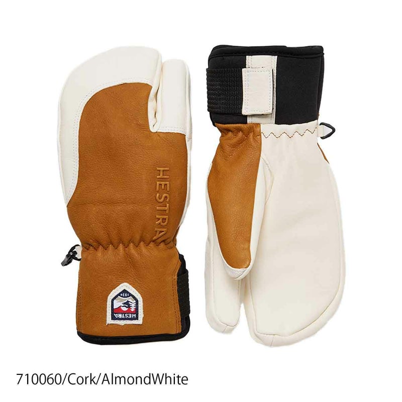 5本指グローブの操作感とミトンの保温力を兼ね備えた3フィンガーモデルは、厳冬期の雪山ライドになくてはならない存在。極寒の大雪山旭岳や吹雪の八甲田でも指先の冷えに悩まされることなく快適なライディングを約束します。ミトン形状ながら独立した人差し指によってスノーボードポールを難なく操作でき、中指から小指までの3本はそれぞれ独立したライニング仕様のため、高い保温力を維持しながらしっかりフィットします。HESTRAの3フィンガーにはさまざまなタイプがありますが、この「Topo 3-Finger」は「3-Finger Full Leahter」をベースに、カフ部分のデザインをすっきりさせた、操作感も軽快なショートカフモデル。手のひら側にネオプレーンを配したベルクロ留めカフは手首にしっかりフィットし、ウエアの袖口を被せて締めればもう万全です。素材は外側はやわらかな牛皮革、手のひら側はカラーによって強度の高いゴート(山羊)皮革と、しなやかな牛皮革があります。ポリエステルライナーは取り外し可能です。