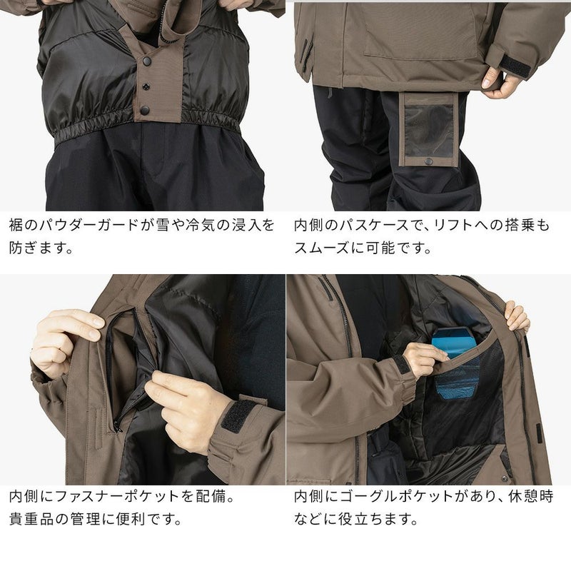 フード、袖口、裾が調整可能で、2つのサイドポケット、ファスナー付き胸ポケット、ゴーグルポケット、IDカードケースが備わり収納力も充実。